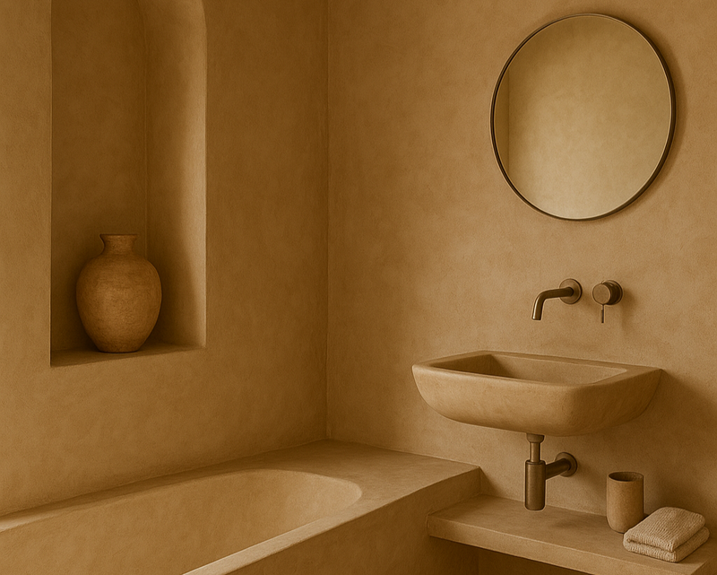 El Tadelakt, de origen ancestral bereber, es una técnica de estuco pulido a la piedra que se impermeabiliza con jabón negro sin perder porosidad, por lo que sigue siendo transpirable regulando así la humedad y evitando el moho.
